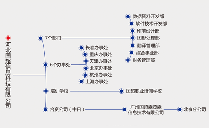 河北國超信息科技有限公司下設(shè)1個中日合資公司、12個分公司、6個辦事處,1個培訓(xùn)學(xué)校。 公司總部內(nèi)設(shè)七個部門:數(shù)據(jù)資料開發(fā)部、軟件技術(shù)開發(fā)部、印前設(shè)計部、圖形處理部、翻譯管理部、綜合事業(yè)部、財務(wù)管理部,分別在長春、重慶、天津、北京、杭州、上海分別設(shè)有業(yè)務(wù)辦事處;擁有1所培訓(xùn)學(xué)校:辛集市國超職業(yè)培訓(xùn)學(xué)校;成立了河北國超勢力工程有限公司、河北國超消防設(shè)備科技有限公司等12個分公司。